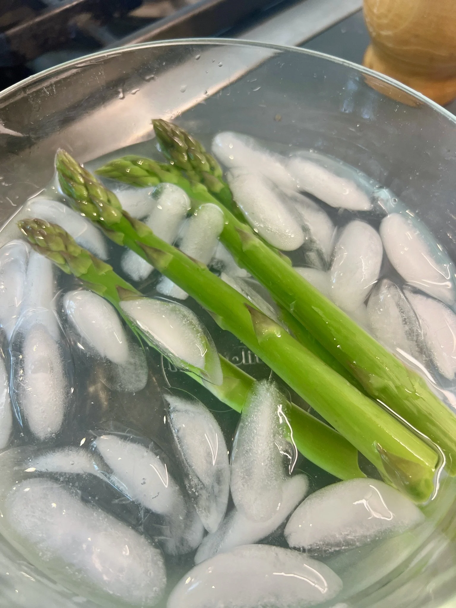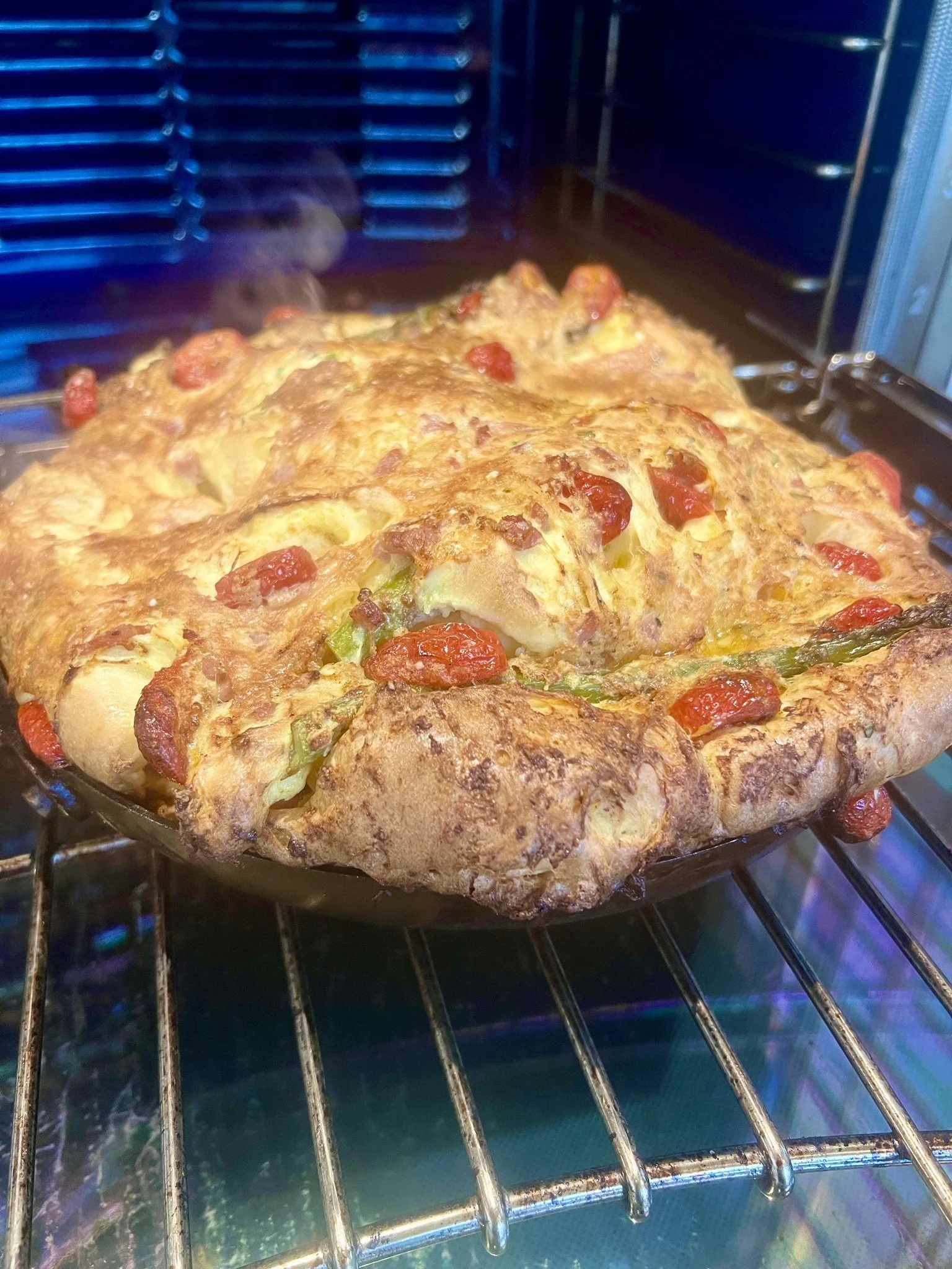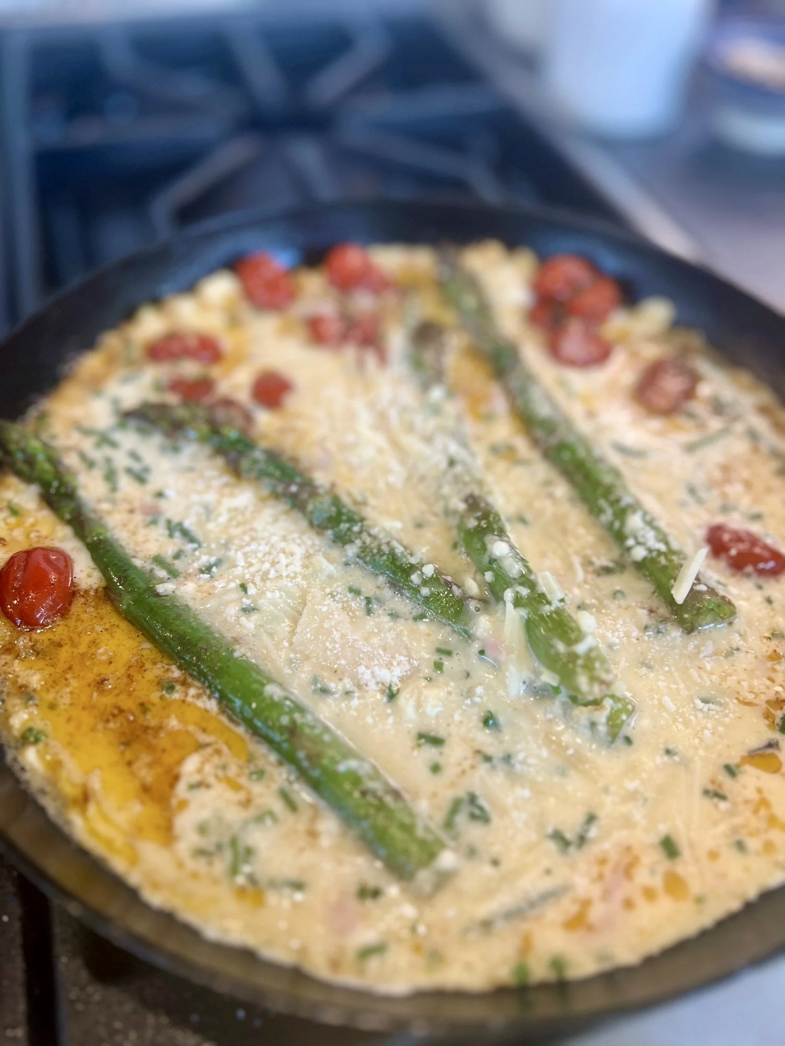 Bake the Dutch Baby undisturbed for 20 minutes. Check briefly to make sure it has browned and leave in the oven for another 5 minutes to crisp up. Remove from the oven with a hot pad (don’t forget that pan handle is HOT!). Serve immediately alongside more freshly blanched asparagus or a tossed green salad.