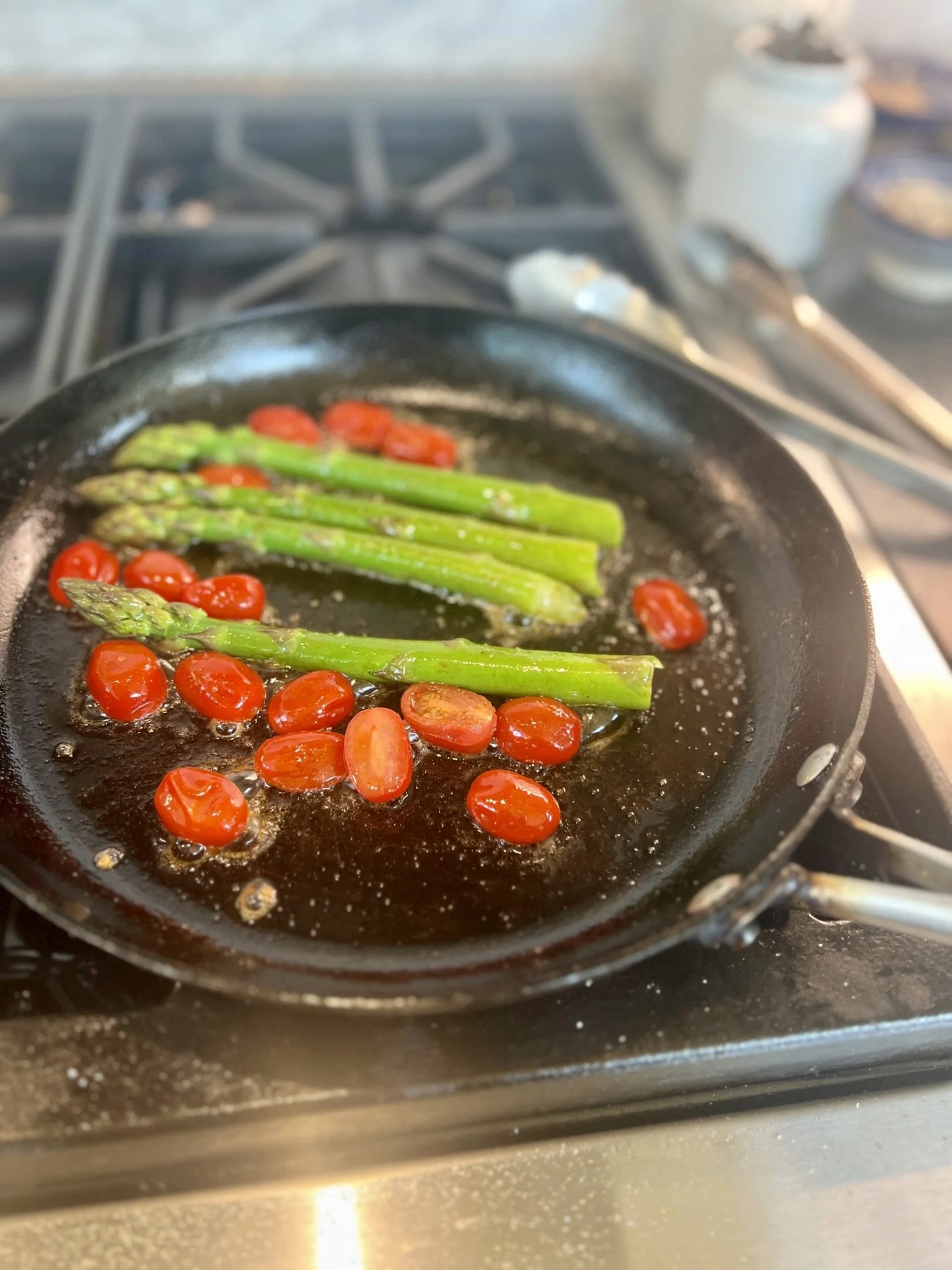 Melt 2 tablespoons of the butter in the fry pan over medium high heat on stovetop. When the butter begins to sizzle add the blanched asparagus and halved tomatoes. Swirl in the pan for about 5 minutes until the vegetables are slightly soft and have browned a little. Turn the heat to low and add the additional butter allowing it to melt.