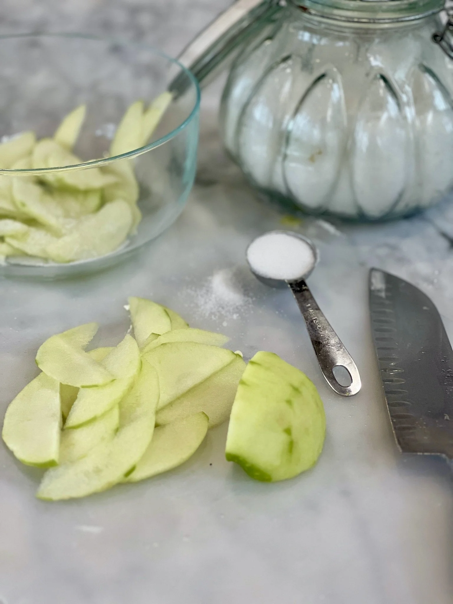 1 large tart apple (Granny Smith, Braeburn, Cortland), peeled, cored and very thinly sliced.