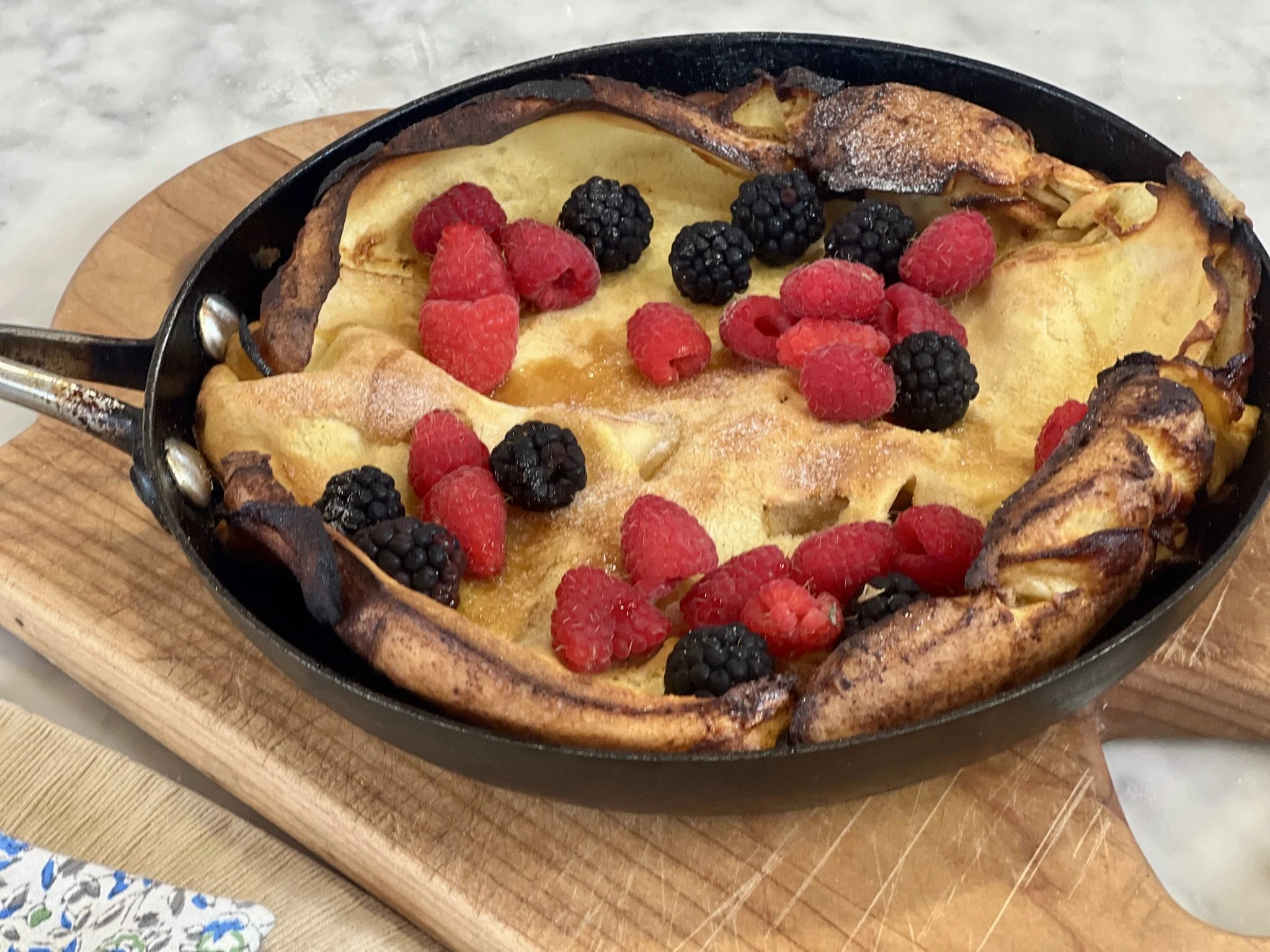 The batter, poured into a sizzling hot buttered pan and placed into a very hot oven, rises to an astonishingly beautiful and delicious puffed delicacy. As it takes its place at the table the tall billowy pancake with a crisp golden crown will raise eyebrows and definitely generate admiring “oohs and ahs.” The recipe is versatile and can be made up either with a sweet component or a savory one as mentioned above.