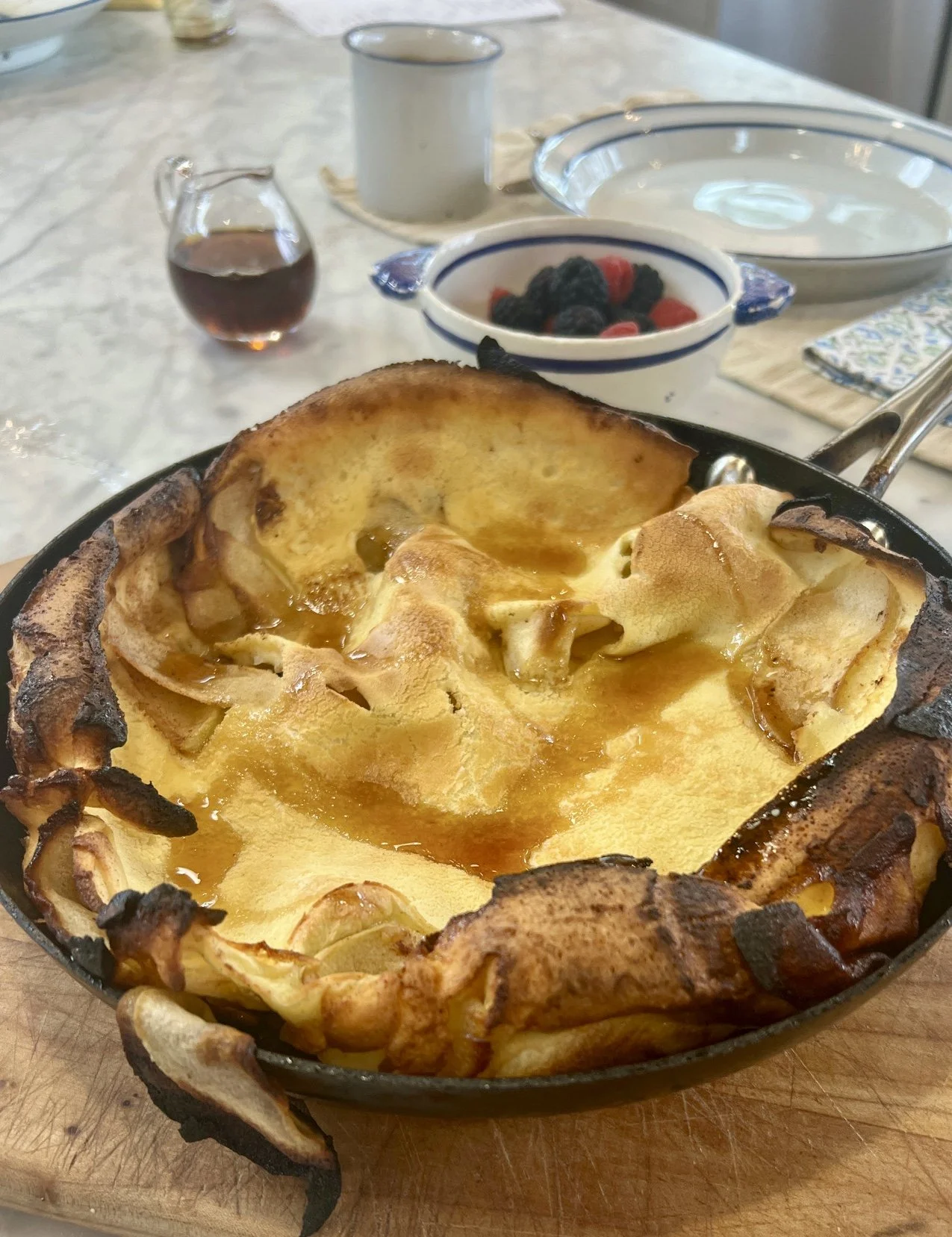 Return the fry pan to the burner on medium high heat, and add remaining butter. Swirl the butter as it sizzles around the apples then pour the batter into the hot mixture. Carefully transfer the pan to the bottom shelf of the preheated oven. Set a timer for 15 minutes and check the pancake to see that it has risen and appears to be dark golden brown around the edges. Give it another 3-5 minutes to crisp a bit around the edges. Remove from oven and serve immediately with a light dusting of powdered sugar, a drizzle of fresh lemon juice, and hot maple syrup.