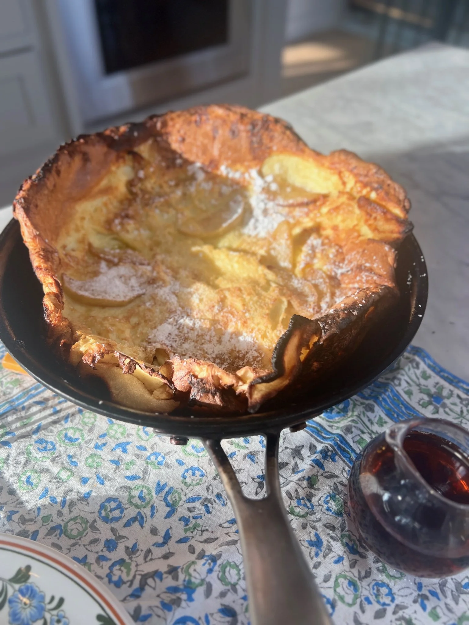 This recipe for an oven baked pancake composed of a simple batter of milk, egg and flour takes only moments to whisk together. It’s an old recipe dating back to the early 1900’s known as a German Pancake or Deutsch Pancake which led to it being called a Dutch Baby. It has never lost its “wow” factor and you’ll find many versions online as well as in NYT Cooking by Melissa Clark and from cooking stars as Ina Garten and The Food Network. Both mouth-watering Dutch Baby recipes I’m sharing are very similar to the many published online as well as by The Food Network and NYT Cooking----one with sautéed apple and another with cheese, herbs and ham.