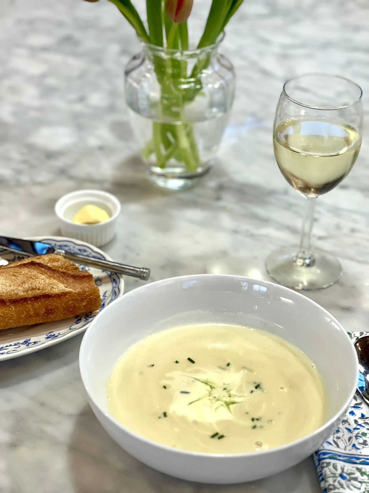 Just as delicious cold as it is hot, the cold version known in French as Vichyssoise had its association in history with French royalty and chefs who cooked for them. The ingredients equate more to a peasant dish –a potato or two, sweet leeks or shallots, broth or just water and salt. Yet, the simplicity is swiftly elevated with the addition of fresh cream, whether served hot or cold, resulting in a dish of elegant flavor and beauty. May this delectable soup be your answer to a lovely meal on a fickle Spring day.
